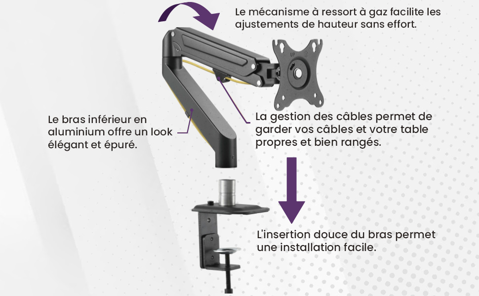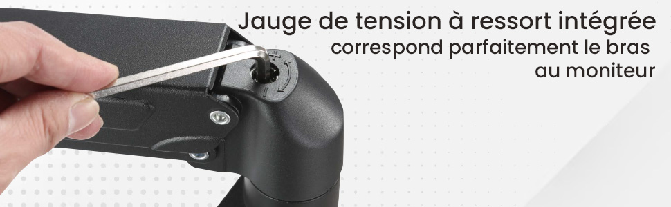 • La jauge de tension à ressort intégrée adapte parfaitement le bras au moniteur.