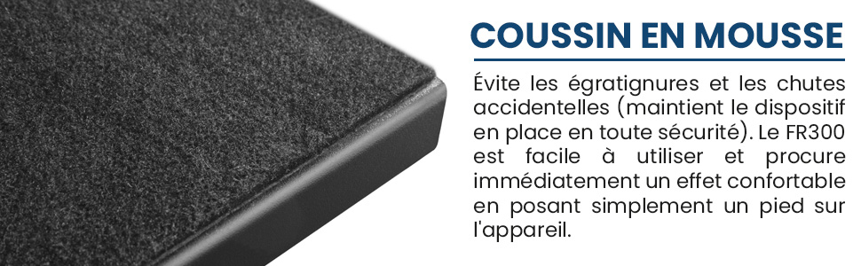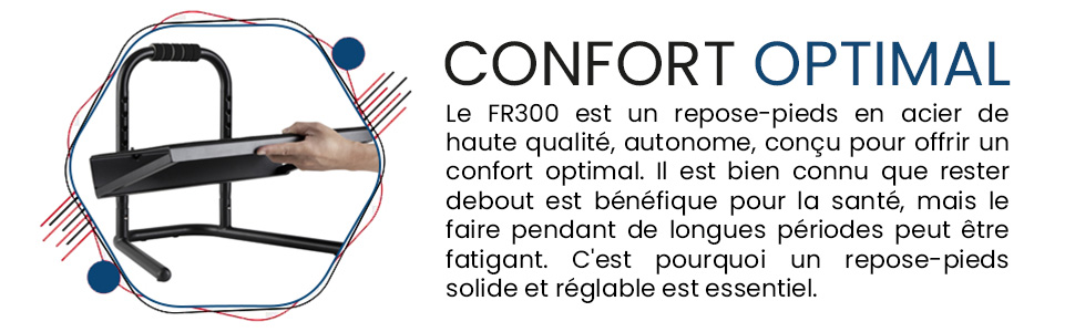 La position debout est saine, mais rester debout pendant trop longtemps ne l'est pas. Un excellent repose-pieds autoportant est nécessaire. Le FR300 est un repose-pieds réglable en acier robuste qui réduit la pression sur les muscles de la jambe, le genou et la cheville. 6 réglages de hauteur relaxants conviennent à la plupart des utilisateurs. Ils permettent également une posture assise confortable. La construction tout en acier maintient fermement le poids de votre jambe en repos. Une surface rembourrée offre une texture douce tout en évitant de glisser. Une poignée en mousse souple agrandit la zone de contact entre votre main et le poteau en acier, facilitant la prise en main. Le FR-03 est facile à utiliser et apporte immédiatement un effet confortable en plaçant simplement un pied sur l'équipement.