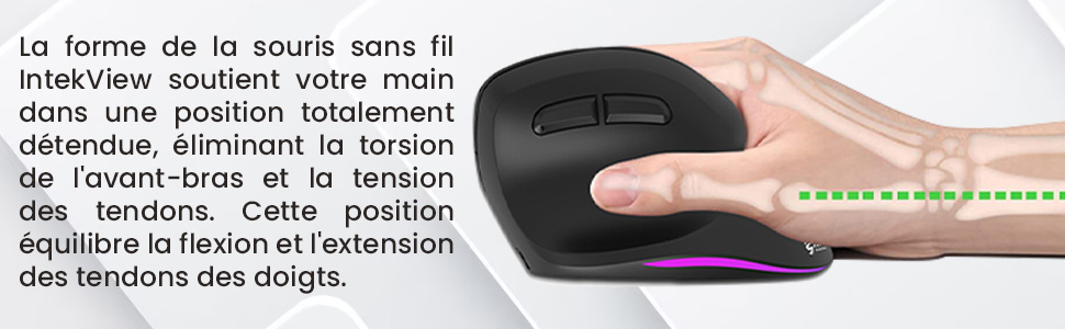 La souris verticale Intekview BT + 2.4G Wireless est spécialement conçue pour offrir un confort optimal tout en réduisant la tension musculaire et les douleurs associées à une utilisation prolongée. Sa conception verticale naturelle favorise une posture saine pour le poignet et l’avant-bras.