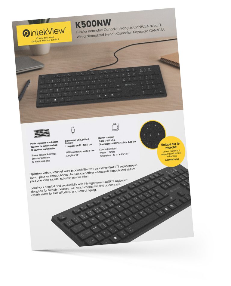 The Intekview K500NW is a compact, wired French-standard keyboard designed to boost your productivity while meeting Canadian government layout requirements. With a comfortable typing experience and modern, accessible features, it’s the perfect solution for both work and everyday use.
